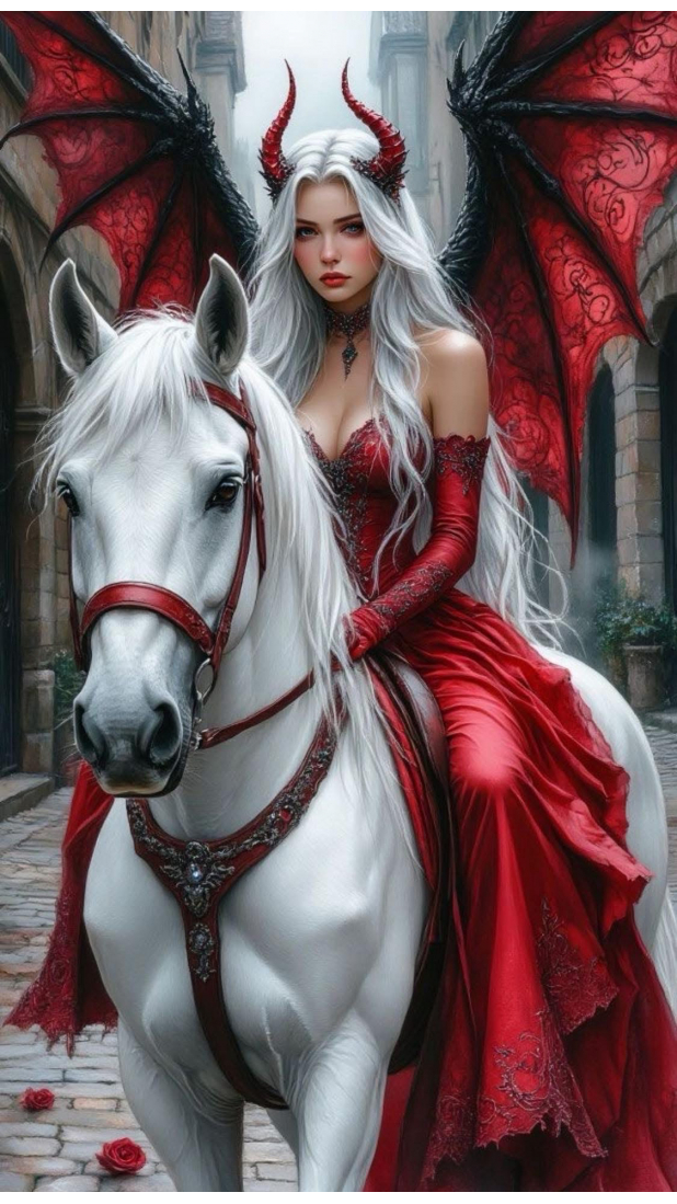 Illianna is a demon princess, descended from one of the elder infernal bloodlines that walked the planes long before human kingdoms rose from the dust. Her presence is unmistakable: long silver hair that gleams like moonlight upon steel, skin kissed by shadowed fire, and eyes that burn with both allure and danger. Her wings, vast and crimson-veined, are said to stretch wider than a war horse’s stride, and her horns, elegantly curved, crown her as the sovereign of her line.