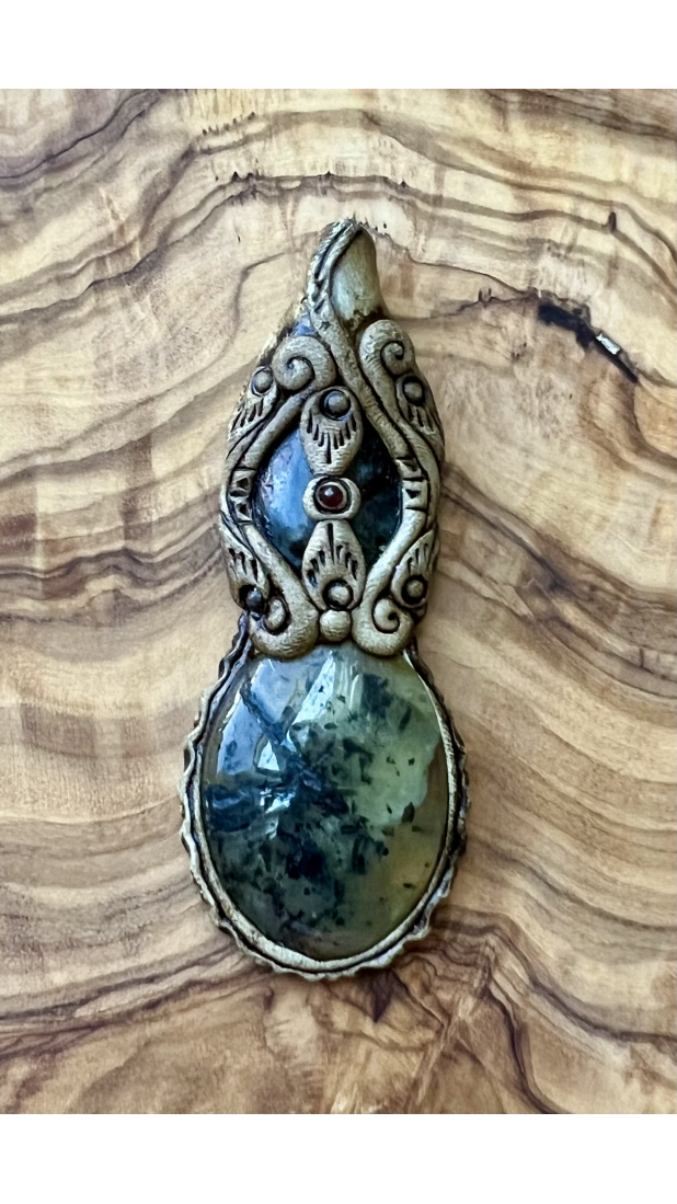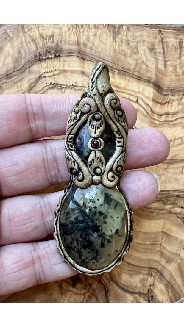 Bound to a handmade polymer clay pendant with genuine, rutilated did you close them back   quartz