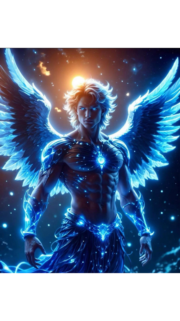 Darynthos is a Star-Guardian — an ancient class of celestial guardian that predates many of the word-making gods. Imagine an angel who was tempered in the furnace of long nights: winged, luminous, and living in the thin place between fate and choice. His chest holds a mote of captured starlight that pulses like a heart; his wings are feathered but edged in light that looks almost like blue flame. He is old enough to remember when the constellations still traded names.
